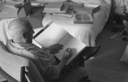 Pablo Picasso works on a piece of writing. [Photo provided to chinadaily.com.cn] |