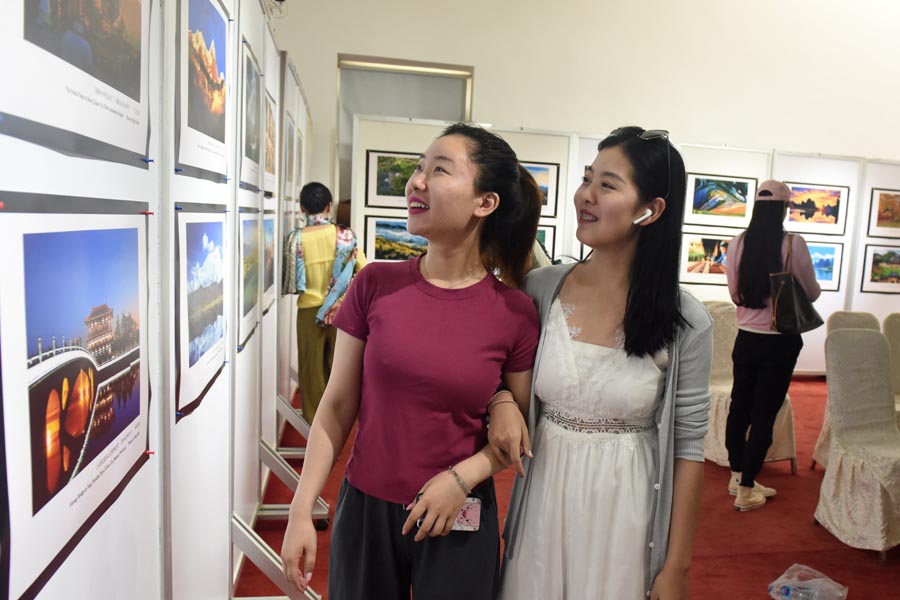 Visitors look at images on display at the China Cultural Center in Pakistan on June 19, 2019, as a sideline event of the China Tourism and Culture Week. The exhibition, titled Beautiful China, showcases photographs portraying the natural and architectural landscapes of China, as well as modern people's lives. [Photo/Chinaculture.org] |