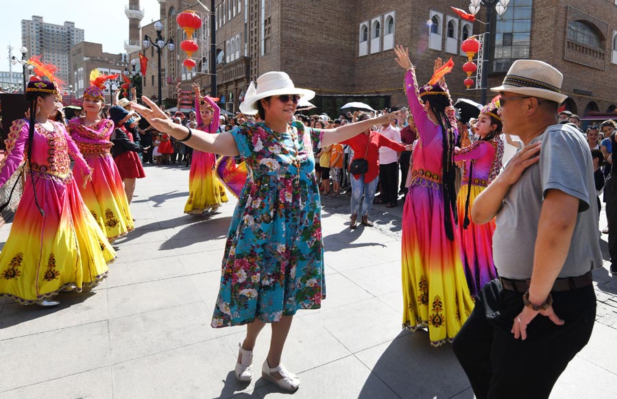 Performers and tourists dance to music in the Grand Bazaar in Urumqi, capital of Xinjiang Uygur autonomous region, July 2, 2019. [Photo/Xinhua]