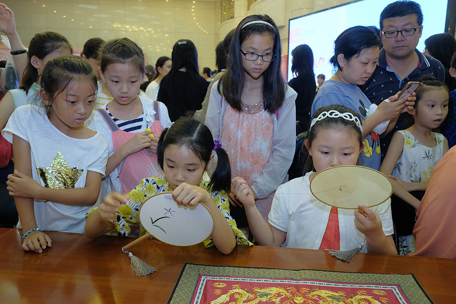Children try stitching on fans at the annual Gate of Music was opened in Beijing on July 5. [Photo provided to China Daily]
