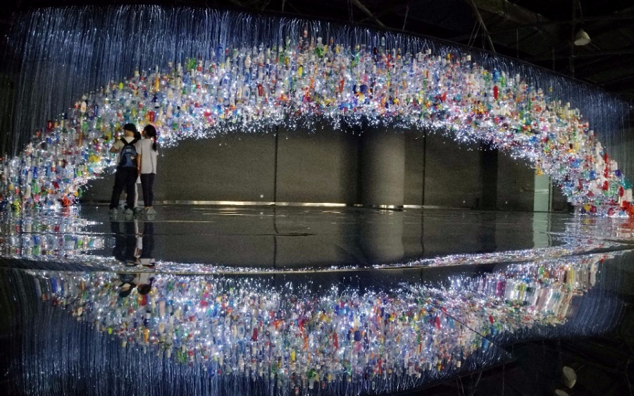 Visitors view an installation artwork made of plastic waste on July 14, 2019 in Shanghai. The artwork made of nearly 20,000 recycled plastic products is recently on display at the Shanghai Science and Technology Museum. The arch is 17 meters wide and when viewed from a distance, presents an oval shape through a reflection on the mirrored floor. The image is meant to underscore our awareness that the plastic garbage belt formed in the ocean is around us all the time, and a reminder that we should reduce the use of plastic materials.[Photo/Xinhua]