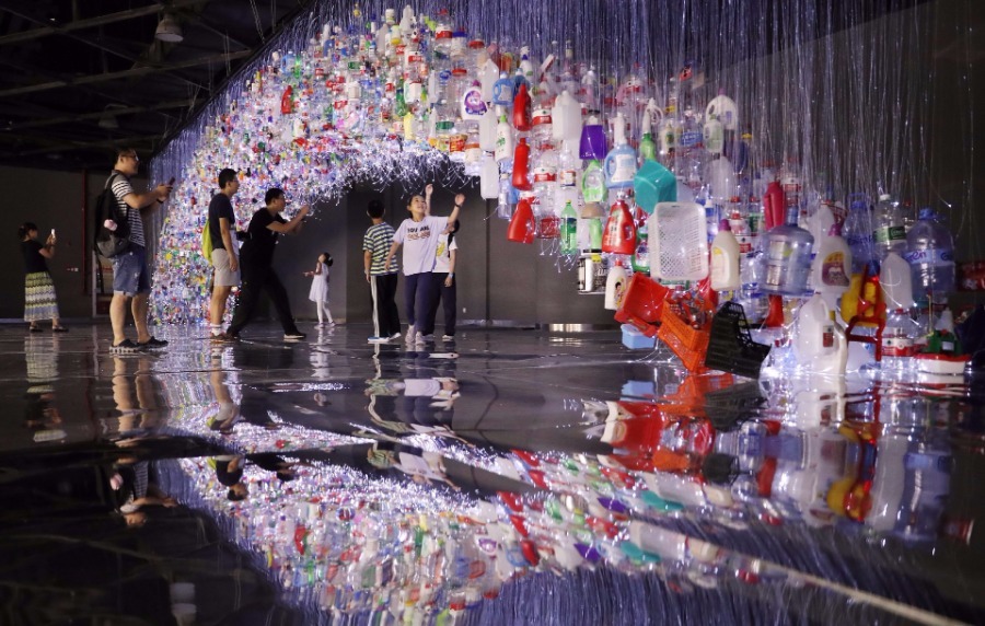 Visitors view an installation artwork made of plastic waste on July 14, 2019 in Shanghai. The artwork made of nearly 20,000 recycled plastic products is recently on display at the Shanghai Science and Technology Museum. The arch is 17 meters wide and when viewed from a distance, presents an oval shape through a reflection on the mirrored floor. The image is meant to underscore our awareness that the plastic garbage belt formed in the ocean is around us all the time, and a reminder that we should reduce the use of plastic materials.[Photo/Xinhua]