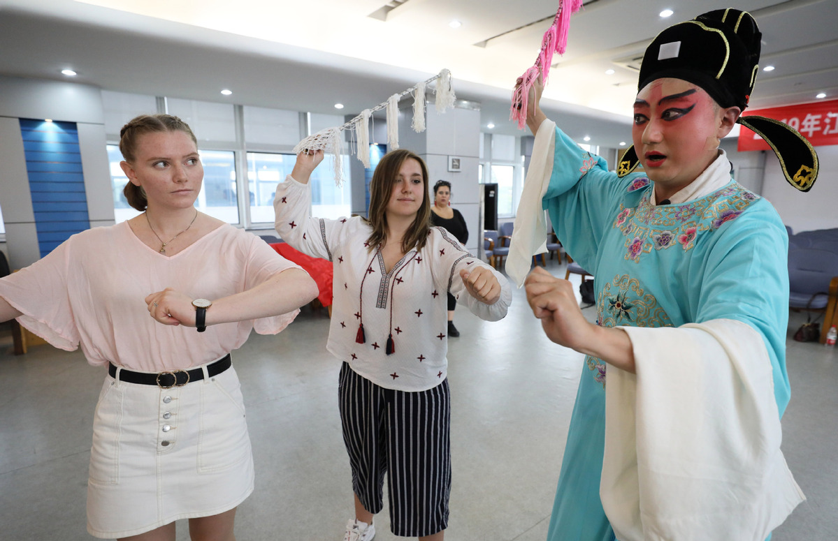 The teacher instructs the students in both the movements and expressions of Chinese opera at Jiangsu University in Zhenjiang city on July 10. [Xinhua]