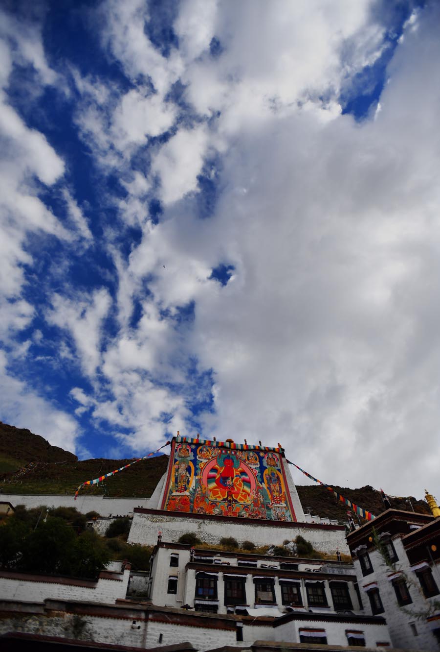 A Thangka painting is displayed at the Tashilhunpo Monastery in Xigaze, Southwest China's Tibet autonomous region, July 15, 2019. Thangka are Tibetan Buddhist artworks painted on cotton or silk. The religious paintings can be traced back to the 10th century and typically depict Buddhist deities. [Photo/Xinhua] |