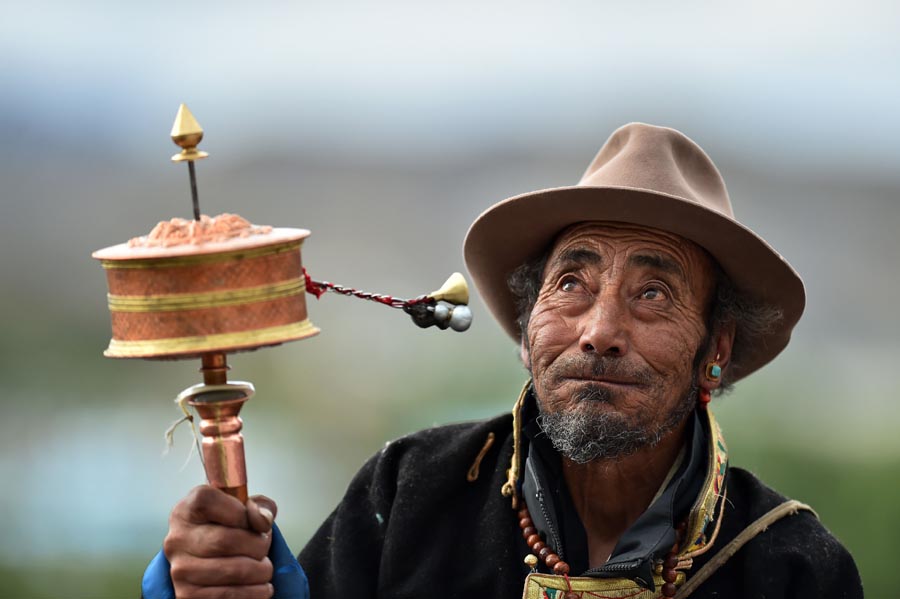 A man attends a Thangka display ritual at the Tashilhunpo Monastery in Xigaze, Southwest China's Tibet autonomous region, July 15, 2019. [Photo/Xinhua]