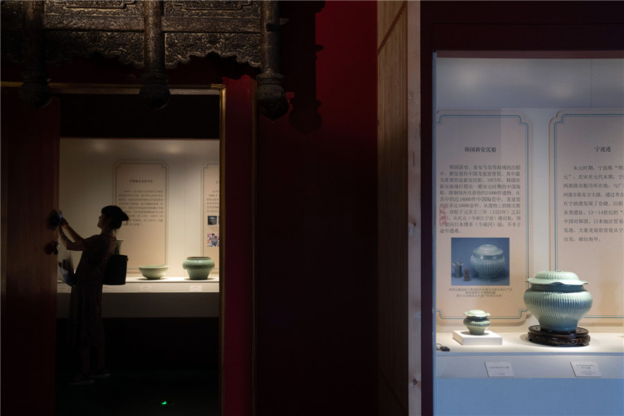 A celadon porcelain exhibition is held at the Palace Museum from July 15 in Beijing. A total of 833 pieces of celadon relics from museum collections of 42 countries demonstrate the development and progress of international cultural exchanges. [Photo/Xinhua]