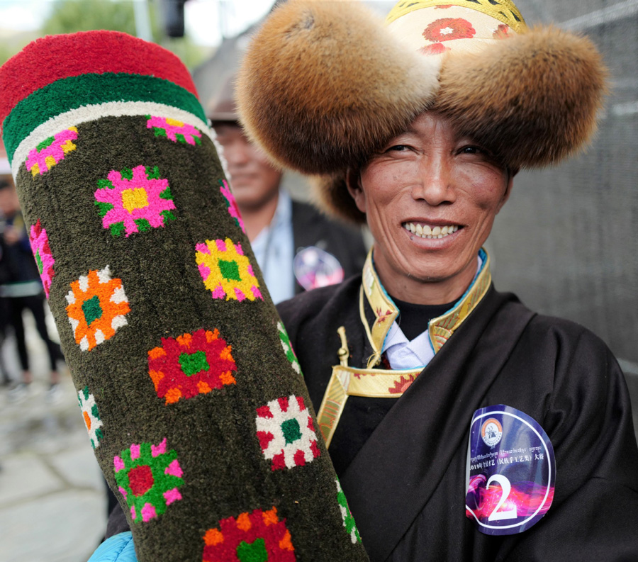 A man displays the Tibetan carpet he made at a talent contest in Qiongjie county, Shannan city, Southwest China's Tibet autonomous region, July 16, 2019. The contest focuses on displaying local craftsmanship to promote the development of rural culture and art. [Photo/Xinhua]