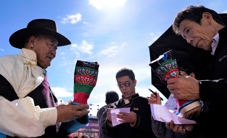 Judges score a pair of Tibetan boots handmade by a craftsman at a talent contest in Qiongjie county, Shannan city, Southwest China's Tibet autonomous region, July 16, 2016. The contest focuses on displaying local craftsmanship to promote the development of rural culture and art. [Photo/Xinhua]