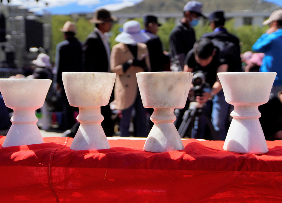 Sculpted goblets are on display at a talent contest in Qiongjie county, Shannan city, Southwest China's Tibet autonomous region, July 16, 2019. The contest focuses on displaying local craftsmanship to promote the development of rural culture and art. [Photo/Xinhua]