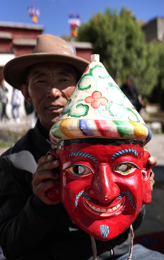 A man displays a Qiangmu (a religious dance) mask at a talent contest in Qiongjie county, Shannan city, Southwest China's Tibet autonomous region, July 16, 2019. The contest focuses on displaying local craftsmanship to promote the development of rural culture and art. [Photo/Xinhua]
