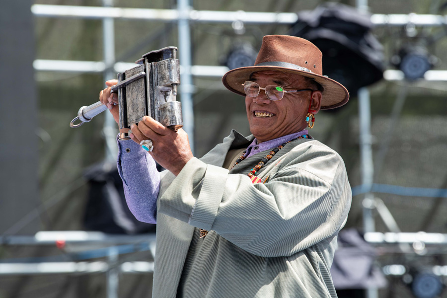 A man looks at iron work at a talent contest in Qiongjie county, Shannan city, Southwest China's Tibet autonomous region, July 16, 2019. The contest focuses on displaying local craftsmanship to promote the development of rural culture and art. [Photo/Xinhua]