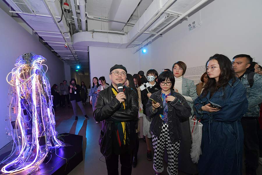 Designer and artist Tim Yip talks at his show, Tim Yip: Mirror . [Photo provided to China Daily]