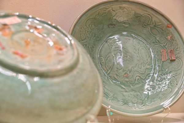 Two Ming-Dynasty Longquan celadon plates collected by the Palace Museum.[Photo by Jiang Dong/China Daily] |