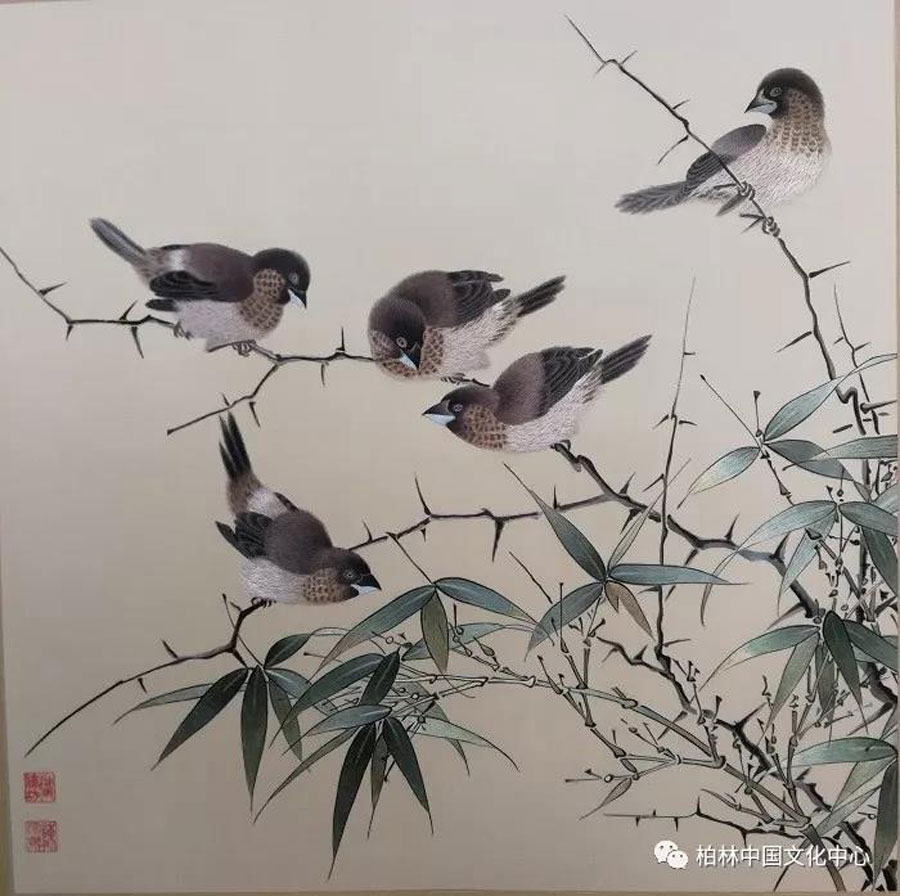 An embroidery work of birds on display at the China Cultural Center in Berlin, July 5, 2019. [Photo/Chinaculture.org]