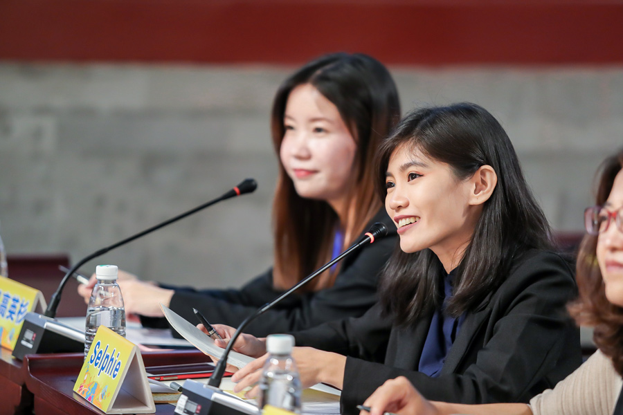 Selphie, one of the judges, comments on the performance of participants during the English public speaking contest organized by 51Talk in Beijing, July 22, 2019. [Photo provided to chinadaily.com.cn]