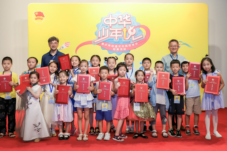 Contestants pose for a group photo at the English public speaking contest competition venue in Beijing, July 22, 2019. [Photo provided to chinadaily.com.cn]
