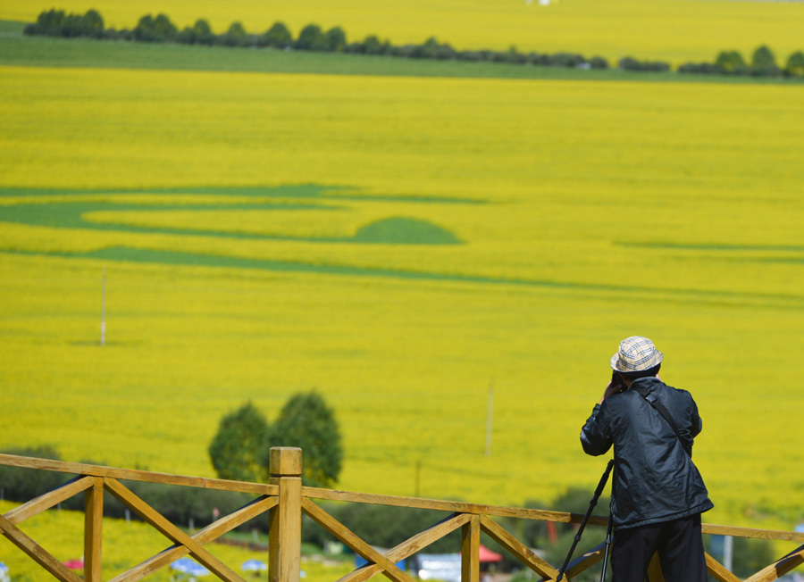 A tourist takes photos of the canola flower fields in Menyuan Hui autonomous county, Northwest China's Qinghai province, July 24, 2019. [Photo/Xinhua]