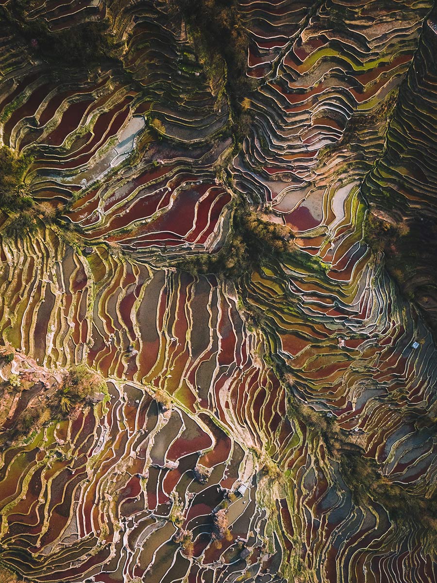 In a photograph taken from above by Jord Hammond, the Yuanyang Rice Terraces in Yuanyang county of Honghe prefecture, Southwest China's Yunnan province seem to be part of a colorful mosaic. [Photo provided to chinadaily.com.cn]