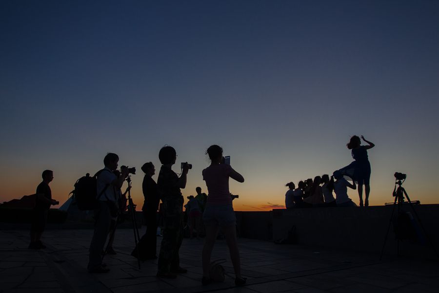 Amateur astronomers greet the sunrise after spending the night watching the Perseids meteor shower in Nanhuizui Park in Shanghai.[Photo by Gao Erqiang/China Daily] |