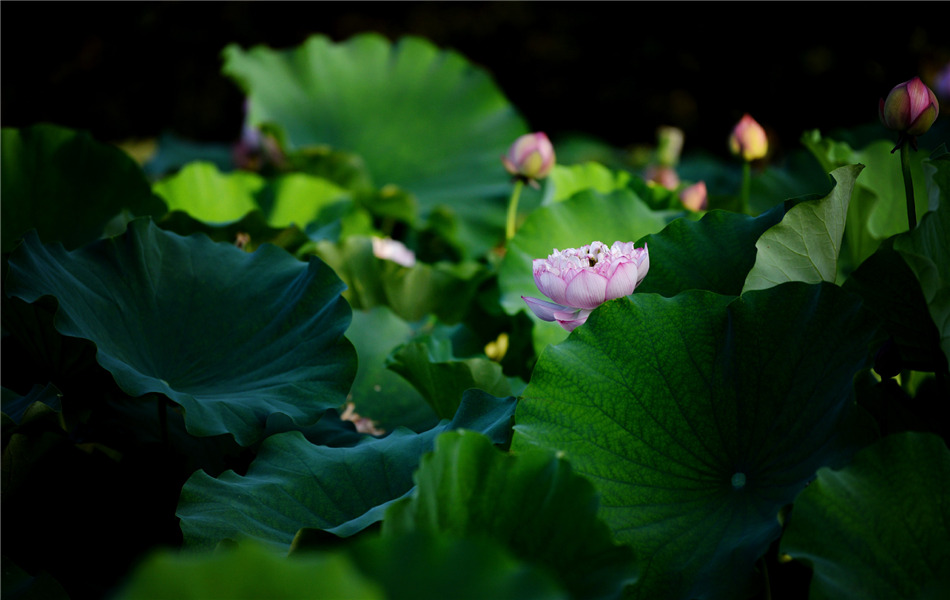 A beautiful lotus flower and the leaves surrounding it are bathed in sunset's fading light at a park in Xi Xian New Area of Northwest China's Shaanxi province, on July 26, 2019. [Photo/Xinhua]