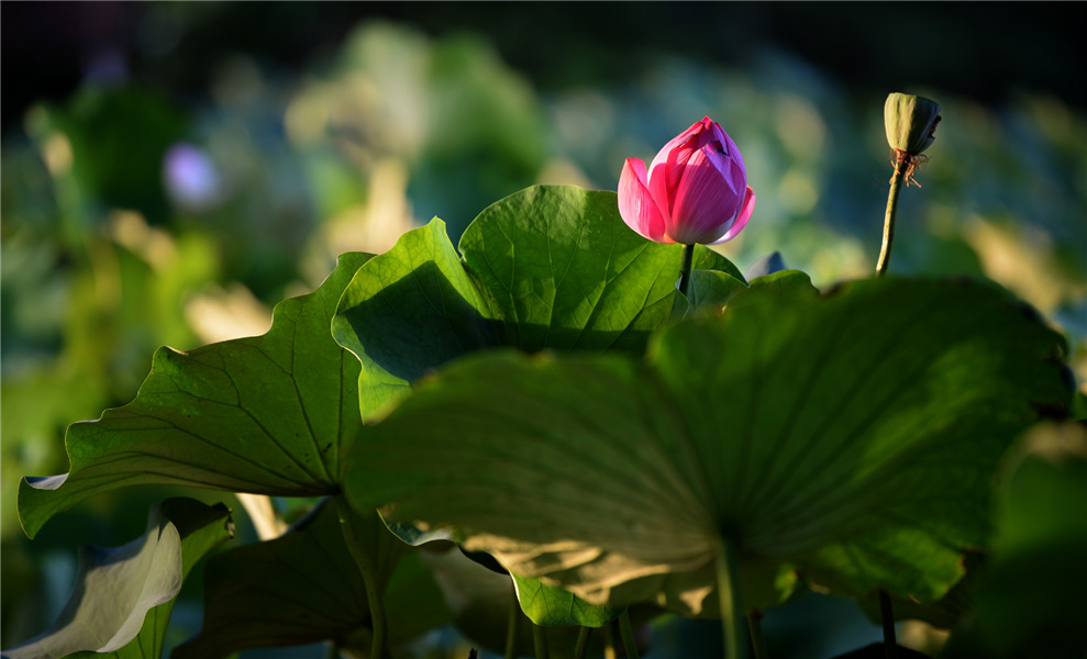 A beautiful lotus flower and the leaves surrounding it are bathed in sunset's fading light at a park in Xi Xian New Area of Northwest China's Shaanxi province, on July 26, 2019. [Photo/Xinhua]