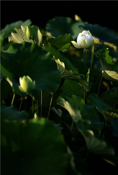 A beautiful lotus flower and the leaves surrounding it are bathed in sunset's fading light at a park in Xi Xian New Area of Northwest China's Shaanxi province, on July 26, 2019. [Photo/Xinhua]