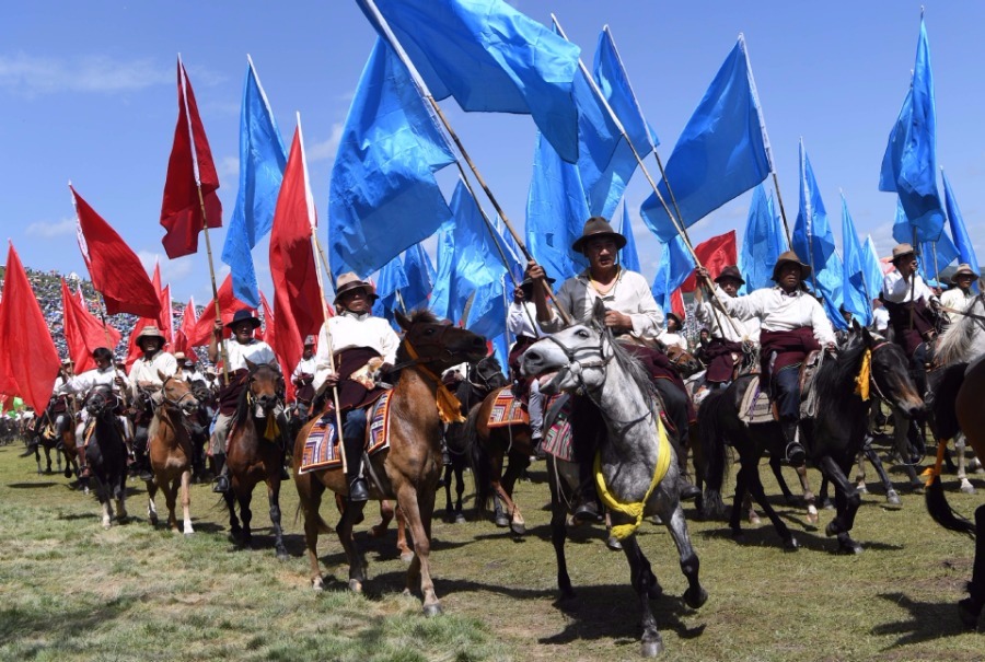 Performances with unique local cultural characteristics are staged at the opening ceremony of the 4th Silk Road (Dunhuang) International Cultural Expo and the 9th Dunhuang Tour-Silk Road International Tourism Festival, in Hezuo city, capital of Gannan Tibetan autonomous prefecture in Northwest China's Gansu province, July 30, 2019. [Photo/Xinhua]