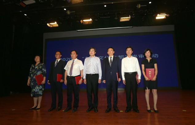 Vice-minister Zhang Xu (center) awards the six counterparts certificates of China’s candidate cities for 2020 Culture City of East Asia, in Beijing, Aug 1. [Photo provided to Chinaculture.org] |