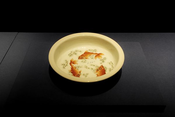 A Qing Dynasty famille-rose basin with goldfish motif.[Photo provided to China Daily] |