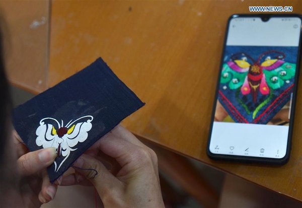 An enthusiast learns the embroidery skill of Yi ethnic group at an experience center in east China's Shanghai, August 4, 2019. Together with volunteers from Shanghai, Ma Suying, a teacher of Yi ethnic group from Yuanyang county of southwest China's Yunnan province, started a workshop providing embroidery training for local women and helped them increase their income through the sale of embroideries. [Photo/Xinhua] |