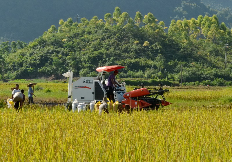 A vehicle helps villagers in Shimen village,GuangxiZhuang autonomous region during the rush to harvest the early rice crop, August 7, 2013. [Photo by Meng Zengshi/asianewsphoto.com] |