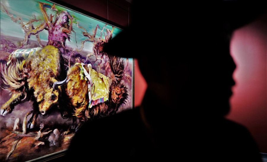 Wu Yuchu visits a yak-themed oil painting exhibition at the Yak Museum in Lhasa, capital of Southwest China's Tibet autonomous region. [Photo/Xinhua] |