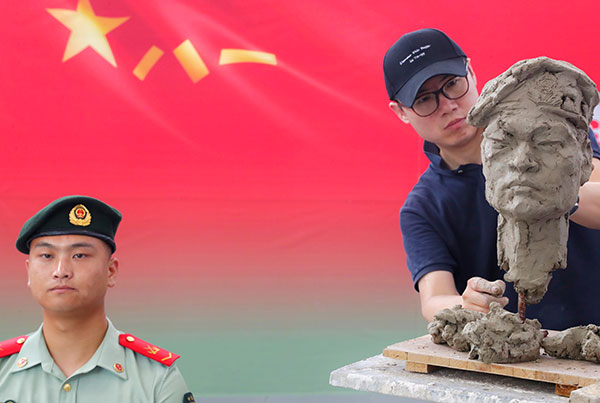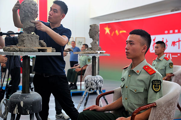 Soldiers sit for portrait sculpting by artists from across the country. [Photo?by Jiang Dong/China Daily] |
