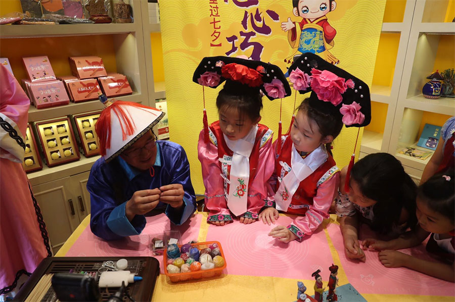 It is said in Qing Dynasty (1644-1911)'s court, women held needlework competitions to celebrate Qixi. Some of these activities are being recreated at the Summer Palace throughout August. [Photo provided to China Daily]