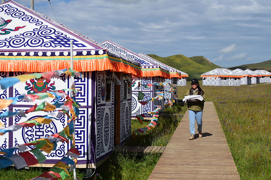 A staff member prepares to tidy rooms of a tent scenic spot at Gaxiu village of Gahai township, Luqu county, Gannan Tibetan autonomous prefecture, northwest China's Gansu province, Aug 13, 2019. In recent years, Gannan promoted culture and tourism industry to boost income of local people.[Photo/Xinhua] |