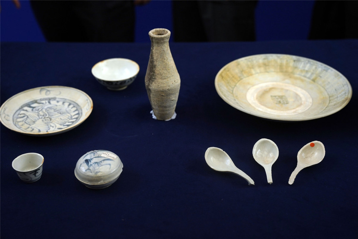 Ceramic relics donated to the National Museum of China in Beijing include spoons, dishes and a bottle, on Aug 13, 2019. [Photo/Xinhua]