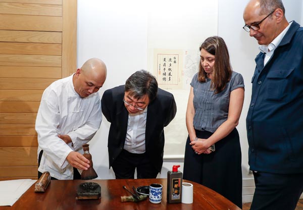 Wei Lizhong (left), curator of Ten Bamboo Studio Art Museum in Hangzhou, demonstrates a Chinese woodblock printing technique to visitors at the London exhibition. [Photo/Xinhua] |