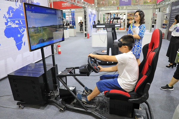 A boy experiences VR technology at last year's book fair. This year's main theme is 5G.[Photo/Xinhua] |