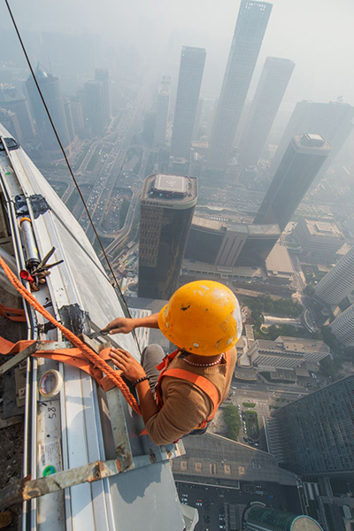 An award-wining image by photographer Wu Bo shows the death-defying moment of a constructor who is working on a high-rise. [Photo provided to China Daily]