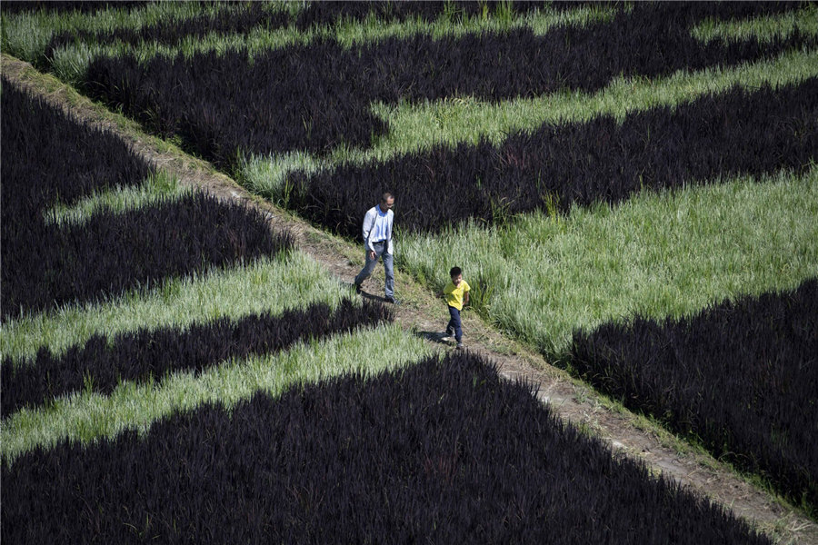 The end of August is the best time to visit the tanbo art park in Qapqal Xibe autonomous county in Northwest China's Xinjiang Uygur autonomous region. Various pictures are created in the lush rice fields. Visitors can walk along the balks or the overlook bridge to observe the agricultural works of art, Aug 20, 2019. [Photo/Xinhua]