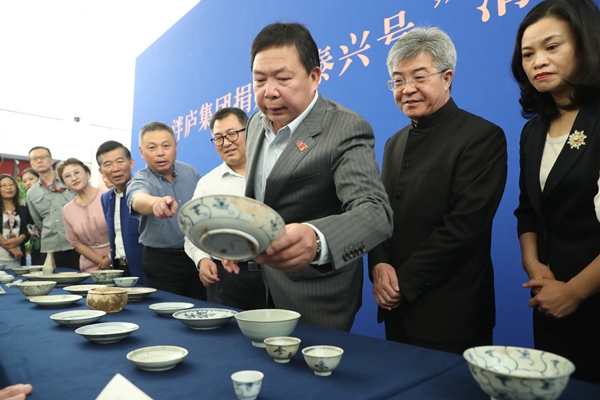 Zheng Changlai (center) introduces donated Dehua porcelain pieces at a ceremony in the museum in Beijing.[Photo by Jiang Dong/China Daily] |
