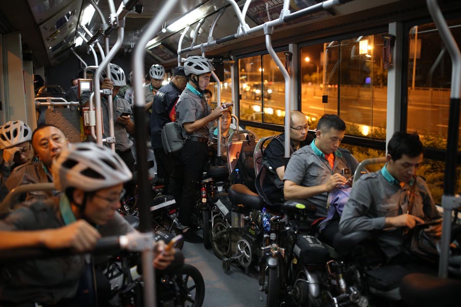 A night bus is full of valet drivers at 2:30 am. [Photo by Feng Yongbin/China Daily]