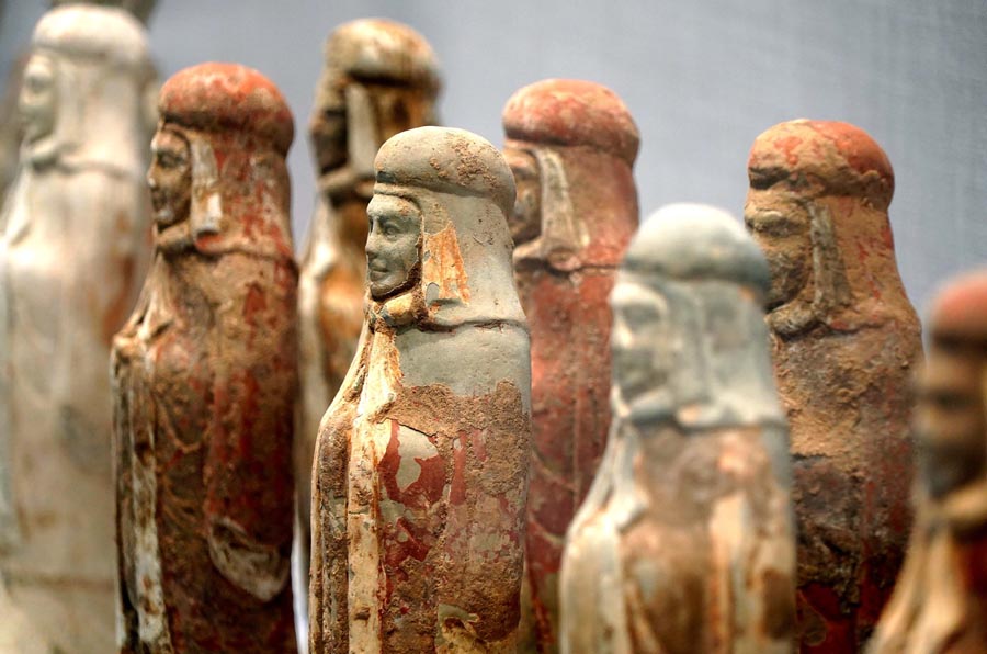 Photo taken on Aug 27, 2019 shows pottery figurines during an exhibition at Zhengzhou Museum in Central China's Henan province. The exhibition on major archaeological discoveries and research achievements in Henan in the past 70 years kicked off here on Tuesday, displaying 1,225 sets of exhibits. [Photo/Xinhua]