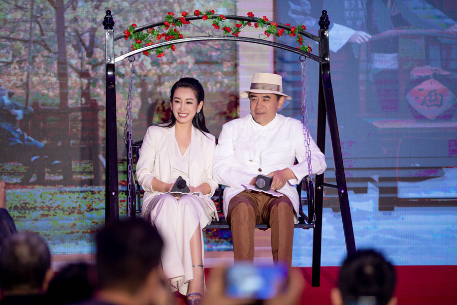 Actress Qin Hailu and Chen go up in a swing, recreating a romantic sequence in the drama at the same event. [Photo provided to China Daily] |