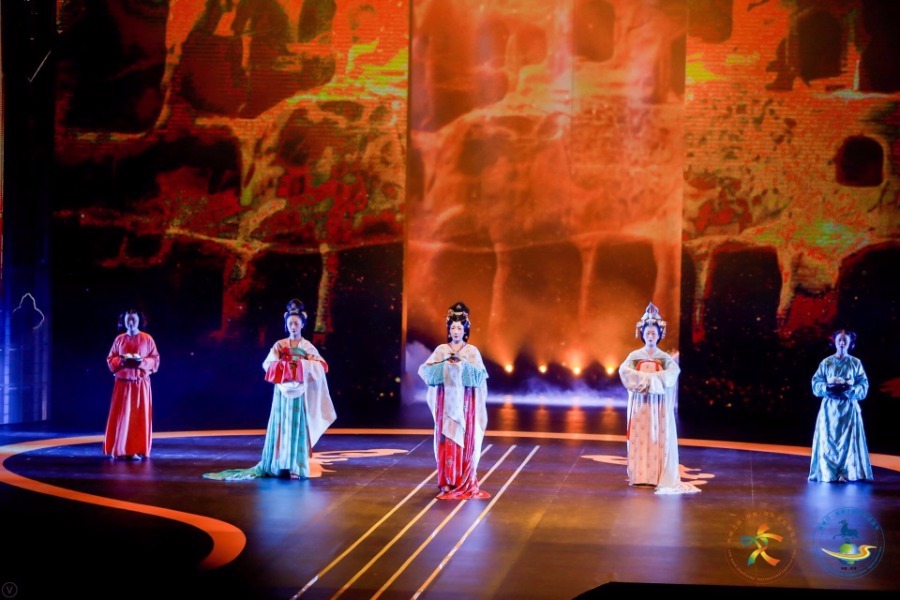 Models present costume designer Chu Yan’s ancient-style dresses at a performance in Dunhuang, Northwest China’s Gansu province, Aug 31, 2019.