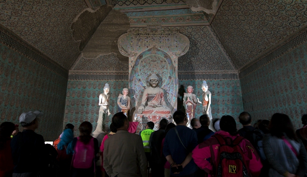 Tourists visit one of the Mogao Caves' 492 Buddhist grottoes in Dunhuang, Gansu province.[Sun Zhijun/For China Daily] |
