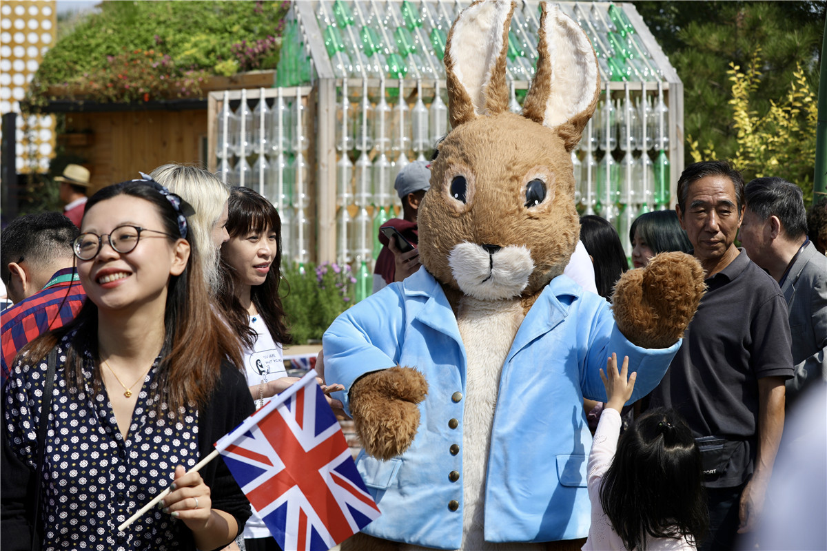 Peter Rabbit meets visitors at the Britain Garden during the Beijing International Horticultural Exhibition in Yanqing district of Beijing, capital of China, Sept 17, 2019. The expo kicked off its UK Day event on Tuesday. [Photo by Zhu Xingxin/chinadaily.com.cn]