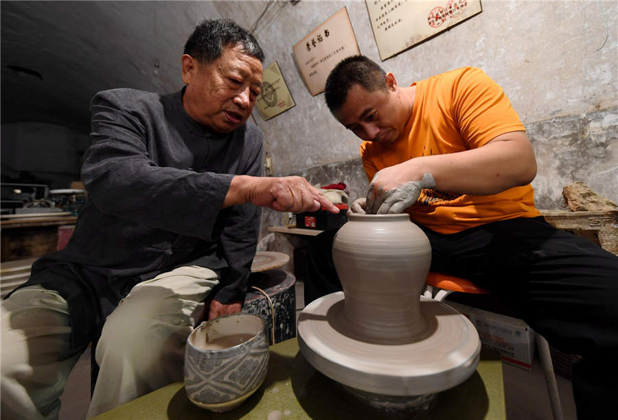Liu Lizhong (L) guides his son on making Cizhou Kiln porcelain at a museum in Handan city, North China's Hebei province, Sept 12, 2019. [Photo/Xinhua]