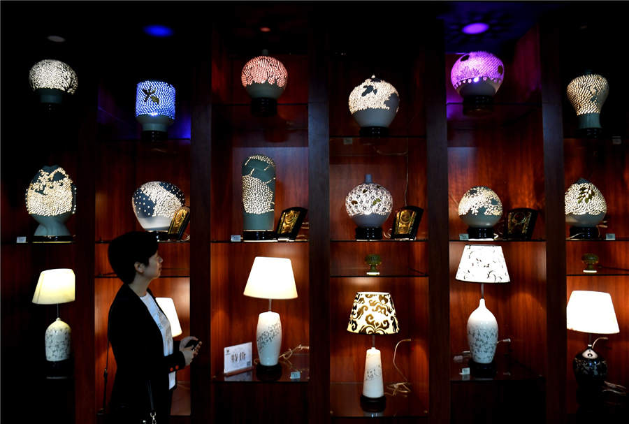 A woman looks at Cizhou Kiln lampshades at a Cizhou Kiln museum in Handan city, North China's Hebei province, Sept 12, 2019. [Photo/Xinhua]