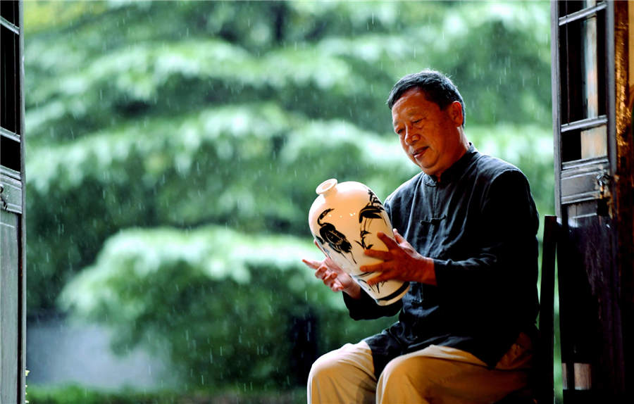 Liu Lizhong examines his Cizhou Kiln work at a museum in Handan city, North China's Hebei province, Sept 12, 2019. [Photo/Xinhua]